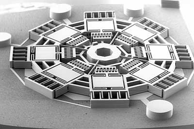 EFAB technology produces devices by forming and stacking a set of thin metal layers, somewhat like a loaf of bread might be assembled from individual slices. The multi-layer nature of the technology is similar in some respects, and shares some benefits with, rapid prototyping technologies (such as stereolithography and fused deposition modeling) used to produce macro scale models and prototypes. However, EFAB is a volume production process which uses tooling and yields functional metal devices with micron-scale features.